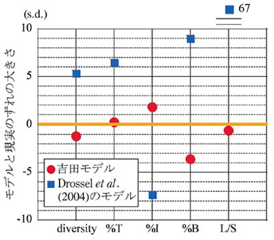 以上のようなプロセスを繰り返してできあがった仮想生態系の例が図1に示されている。いわゆる生態系のピラミッドのように,食われるものを下に,食うものを上に並べてある。生産者である植物が生態系のベースとなっており,植食性の動物が1次消費者としてピラミッドの2段階目に積み重なっている。さらに肉食動物や雑食動物が2次消費者,3次消費者とその上に積み重なるという,実際の生態系によく見られる構造になっている。この例では5つの栄養段階が確認された。図2は生態系の構造を表すいくつかのパラメータについて,本研究のモデルと既存の最新のモデルDrossel et al.(2004)のどちらが実際の生態系の値に近いのかを比較したものである。Drossel et al.(2004)のモデルは,生物の進化だけでなく,えさを捕まえて消化して体内に取り入れるまでのタイムラグやお腹がいっぱいになったら食べるのをやめること,最小の労力で最大の利益を得られるえさを選んで捕食すること,など,生物学的に妥当なプロセスが詳細に組み込まれている。これらは本研究のモデルには導入されていないので,一見 Drossel et al.(2004)のモデルの方が優れているように見える。しかし,構築された生態系を比べたとき,本研究のモデルの方が実際の生態系に近い値を再現できていた。この点で本研究のモデルは既存のモデルよりも優れていると言える。この原因は,モデルが想定している時間スケールと,導入された仮定の不一致にあると思われる。種多様性の高い生態系を構築するためには,種を進化させながら種間相互作用を構築することが有効である。しかし,例えばお腹がいっぱいになったら食べるのをやめることなどは,種の進化よりもはるかに短い,個体レベルの時間スケールで成り立つものである。そのため,不適切な時間スケールのプロセスを含まない単純なモデルの方が現実に合うと考えられる。