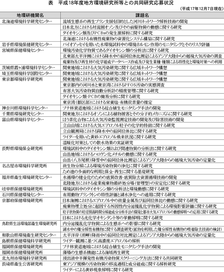 平成18年度の地方公共団体環境研究機関と国立環境研究所との共同研究課題について