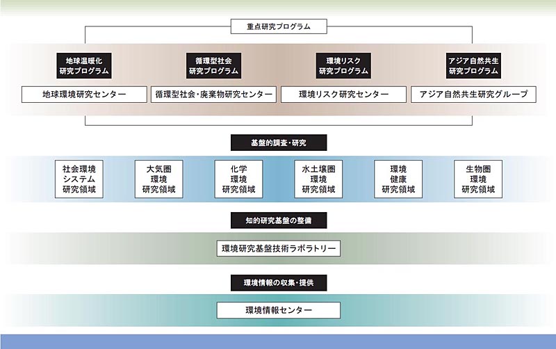 第二は,国の中核研究所として逃してはならない機能をカバーする研究である。大気・水土壌・生物といった環境域,都市・生産など人間活動にはまだまだ人々の安全・安心な生存・生活を脅かす多くの環境悪化要因が存在する。また,未知の環境悪化要因に予防的に取り組む先見的な研究も要る。さらに,環境科学での最新の知見・考え方・手法・技術を発展させておく役目もある。これらは,6つの基盤的調査・研究部門が主として担当する。