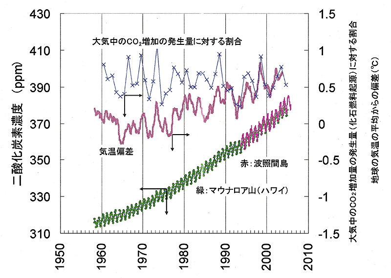二酸化炭素の観測のパイオニアであるCharles Keelingはハワイのマウナロアにおいて1958年から観測を開始し,約50年にわたるデータを提供し,この研究に多大な貢献をしてきた。この間に,二酸化炭素の濃度変化が毎年一定でないことや,排出された二酸化炭素が自然界に吸収されていることなど数々の重要なことを明らかにしてきた。しかし,非常に残念なことに昨年6月20日に77歳の生涯を閉じた。TRENDSというデータベースには1958年3月の彼の二酸化炭素観測値が315.71ppmであったことが示されているが,現在の大気の二酸化炭素濃度はもうすでに380ppmを超えているので,約70ppmがここ50年間に増加してしまったことがわかる。その間に,人間活動による化石燃料消費やセメント生産による二酸化炭素発生量合計は,23億トン-炭素/年(1958年)から73億トン-炭素/年(2003年)に増加し,二酸化炭素の濃度増加を加速させてきたことになる。