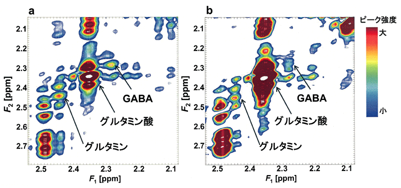 次に,この方法を用いてボランティア測定を行ってみました。この結果得られたヒト脳のスペクトルを図3bにします。このスペクトル上でも,試料スペクトルと同様に,F1側から眺めたそれぞれのピークを1つにすることができまして,グルタミン酸,GABA,グルタミンのそれぞれのピークを検出することができました(図3b)。従って,以上のような特徴を持つ今回の方法を用いることでヒト脳内から次に,この方法を用いてボランティア測定を行ってみました。この結果得られたヒト脳のスペクトルを図3bに示します。このスペクトル上でも,試料スペクトルと同様に,F1側から眺めたそれぞれのピークを1つにすることができまして,グルタミン酸,GABA,グルタミンのそれぞれのピークを検出することができました(図3b)。従って,以上のような特徴を持つ今回の方法を用いることでヒト脳内からグルタミン酸とGABAのピークを良好に検出することができるようになりました。