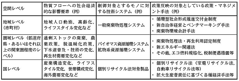 ただし,物質フローへのどのような社会経済的影響要素を想定して,どのようなモノ(物質フローを考える場合,原料や製品,廃棄物,再生原料,再生製品など物質は形態等を変えていきますが,それらを総称して以下では「モノ」と呼ぶことにします)をターゲットするかについては,このままだとかなり広範になりますので,研究を進めるにあたっては,もう少し具体的な対象に絞る必要があります。以下のサブテーマでは,近未来の目標を実現する手だてとして,技術システムと社会システムづくりの観点から検討することとしており,そこでそれらのシステムづくりを市町村自治体のような地域レベルから,都道府県あるいはそれより少し広い圏域レベル,そして国レベルで行っていこうと考えています。そして現時点では,それぞれの空間レベルに応じた物質フローに影響する社会的要素,対象とするモノと技術システム,目標を実現するための政策的手だてを表1のように考えているところです。このあたりは研究を進めていきながら軌道修正なども適宜していきたいと考えています。