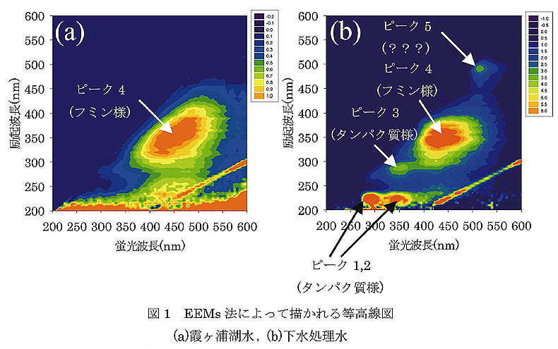 分子にある波長の光(励起光)を当てると,物質はエネルギーを持ち基底状態から励起状態へ遷移します。その直後,物質が元の基底状態へ戻る際,様々な波長を有する光(蛍光)を放出します。どういった波長の蛍光を発するかは物質によって異なっており,蛍光強度は物質量に比例するため,蛍光分析は物質量の定量において広く用いられています。例えば藻類量の目安であるクロロフィルaは,波長が430nm付近の励起光を照射すると660nm付近の蛍光を発する性質を持っているため,その蛍光を測定し,クロロフィルa量の測定を行うのが一般的です。EEMs法はそうした蛍光分析の手法を応用した測定方法です。試料に様々な波長の励起光を照射し,発せられる蛍光の強度を波長ごとに測定します。例えば私の研究室では,200~600nmの励起光を5nm刻み(200nm,205nm,210nm…600nm)で照射し,発せられる蛍光のうち,200~600nmの蛍光強度を5nm刻みで測定しています。その後,縦軸に励起波長,横軸に蛍光波長,高さ方向の軸に蛍光強度のデータをプロットすることで図1の様な3次元の等高線図を描くことができます。図1(a)は1998年7月の霞ヶ浦湖水データ,(b)は河川を介して霞ヶ浦に流れ込む下水処理水のデータです。あちらこちらに山(ピーク)を確認することができます。このピークの位置から,どのような物質が含まれているか?をおおまかに推定することができますし,ピークの高さから,どれくらい含まれているか?を理解することができます。例えば,図1のピーク3はタンパク質様物質に由来するものであり,ピーク4はフミン様物質に由来するものであると言われています。