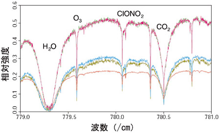 しかし,スコット基地は南緯78度に位置し,オゾンホールが発達する8月~9月にはまだ太陽が昇らず,太陽光赤外線を光源に用いた精度の良い観測ができません。それに比べ昭和基地は,南緯69度・東経39度という南極では比較的低緯度に位置しているため,8月以降は太陽光を観測に用いることができるというメリットがあります。また冬季には,ほぼ常時南極全体を覆う「極渦」の勢力圏内に位置します。(たまに,極渦の境界に位置したり,ごくまれに冬期間にも極渦の外に出ることもあります。)オゾンホールが極渦内に起こる現象であることを考えると,まさに昭和基地は,太陽光を用いてオゾンホールを観測するにはうってつけの場所に位置するわけです。我々はこの昭和基地のメリットを活用し,高分解能FTIRによる観測を今年3月から行ってきました。図1に,昭和基地における初観測によって今年3月25日に得られたFTIRのスペクトルデータを示します。詳細な解析はこれからですが,オゾン破壊に関連したO3, N2O, ClONO2, HCl, H2O, NO2等微量気体成分の吸収スペクトルの観測に成功し,これまでに約40日間の良好なデータが得られております。