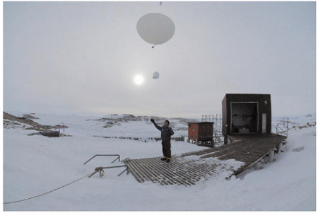 最後に,オゾンマッチ観測について紹介します。オゾンは,フロンから遊離される活性塩素などによる化学反応による破壊のほかに,気圧・気温の変化など,気象学的要因によっても見かけの量が変わってきます。そのため,オゾン破壊物質による純粋な化学的オゾン破壊量を正確に見積もるためには,同じ空気塊(くうきかい)を気象力学的な計算によって追いかけ(流跡線(りゅうせきせん)解析と呼ぶ),オゾンの変化量を調べることが有力な手段となっています。このような解析手法のことを「マッチ解析」と呼び,オゾンゾンデによるオゾン観測に応用したのが「オゾンマッチ観測」です。この手法によって,1990年代から主に北極域を中心に,オゾン破壊量の定量化が行われてきました。具体的には,ある観測点におけるオゾンの鉛直分布を開始点にした流跡線解析を行い,その空気塊が別の観測点上空近傍半径300km以内を通過する予定時刻を計算し,その基地にあらかじめ通知してオゾンマッチ観測を行うことにより,前後2つのオゾン観測量の差から,オゾン破壊量を定量的に算出するというものです。図2に,昭和基地でのオゾンゾンデ観測風景を示します。
