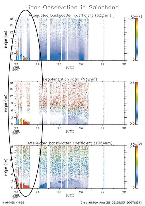 夏でも黄砂が発生しました。2007年8月,サインシャンドでの設置作業中に試験観測がはじまると黄砂が発生しました。写真2の上段が通常の景色,下段が黄砂に覆われている状態です。この時のライダーデータのリアルタイム解析表示画像が図2で,3画像とも縦軸が高度,横軸が時間(国際標準時)です。上段(a)は,波長532nmの散乱強度で赤色ほど散乱が強いことを示し,中段(b)は偏光成分の強度で黄砂など非球形粒子ほど赤色を示します。下段(c)は1064nmの散乱強度を示しています。8月23日3時(国際標準時)から約9時間黄砂が発生している状態となり,特に6時間は上段の散乱強度,中段の偏光成分とも赤色で表示されていることから高濃度で1000mほどの厚さの黄砂層が地上を流れて行く状況がわかります。この黄砂は,翌日北京でも観測されました。