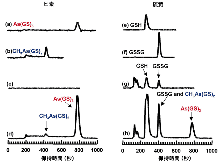 HPLC-ICP-AES法は標準物質と試料中の化合物の保持時間の一致により,その化合物の化学形態を同定します。例えば,(d)と(h)の両方とも保持時間780秒にピークが検出されています。これは,保持時間780秒で検出された化合物がヒ素と硫黄を含んでいることを示しています。また,(d)の420秒のピークと780秒のピークは,それぞれ合成したCH3As(GS)2の保持時間(b)とAs(GS)3の保持時間(a)と一致したことから,ヒ素を投与したラットの胆汁中にはCH3As(GS)2とAs(GS)3が存在していることが分かりました。