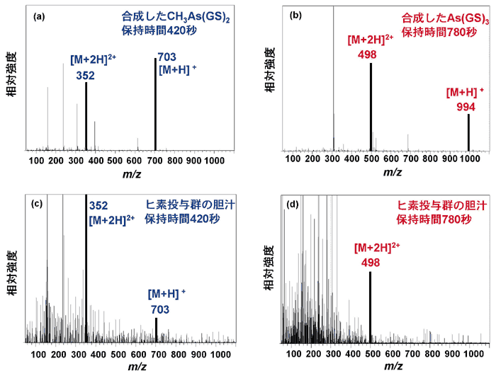 ESI法の大きな特徴として,多価イオンの生成が起こることが挙げられます。正イオンモードならば試料分子にプロトン(H)が付加した正の多価イオン[M+nH]n+ が生成します。マススペクトルは縦軸に生成したイオンの強度を示し,横軸は質量/電荷数(m/z)を示しているので,多価イオンが生じ電荷数が増えるとm/z値が低くなります。合成したCH3As(GS)2のマススペクトルではm/z が703と352にピークが検出され,合成したCH3As(GS)2と保持時間420秒に検出されたラット胆汁中の化合物のマススペクトルが一致したことから,ヒ素を投与したラットの胆汁中にはCH3As(GS)2が存在していることが分かりました。