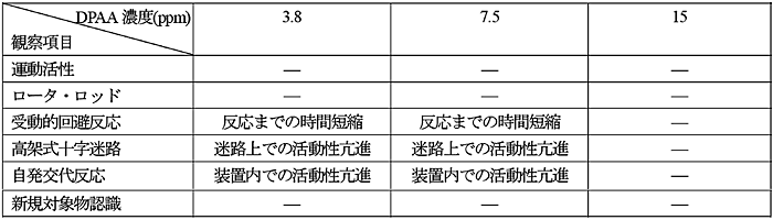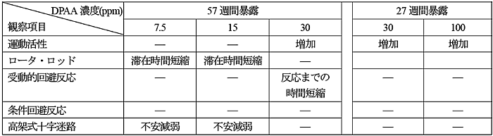 筆者が所有する行動試験法により構成されたテストバッテリーを適用した例として,有機ヒ素の一種であるジフェニルアルシン酸の試験結果を紹介します。成獣(大人のマウス)に長期間与え続けた実験(慢性暴露実験)(表1)と,胎児~乳児期の発達期に限定して与えた実験(発生毒性試験)(表2)を実施しました。成獣の場合は,比較的高濃度(30~100ppm;1ppm=1ml中に百万分の1グラム含まれる濃度)を27週間与えた実験と,より低濃度(7.5~30ppm)を57週間与えた実験を行いました。30ppm以上で運動活性が増加しました。これは興奮性が高まっていることを示しており,人では興奮しやすい,イライラしやすい,睡眠の質が変化する(入眠困難や熟睡できない)等に通じる影響です。条件回避反応の学習も遂行も障害されませんでしたので,人の学習能力や状況に応じて行動する能力には影響しないものと予想されます。しかし,受動的回避反応試験の結果から,比較的高濃度に長期間暴露された場合は記憶障害が生じる可能性が考えられます。また高架式十字迷路試験の成績から,暴露が長期に及ぶと不安を感じ難くなるという感情面への影響も疑われます。注目すべきはロータ・ロッド試験の成績です。この試験では回転する棒の上にマウスが滞在できる時間を測定します。従って,滞在時間が短縮するということは四肢を上手く働かせることができないことを意味します。ジフェニルアルシン酸は人に歩行障害等をもたらす可能性があります。