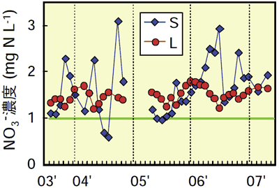 図2は,S・L地点で雨の降っていない時に採取した渓流水中のNO3-濃度の変動を示しています。両地点のNO3-濃度は,ある程度変動するものの,常に高いレベルを維持していることが分かりました。この結果は,森林からの顕著な窒素流出が年間を通して起きていることを示しており,これらの森林が既に窒素飽和していることを示すものと言えます。