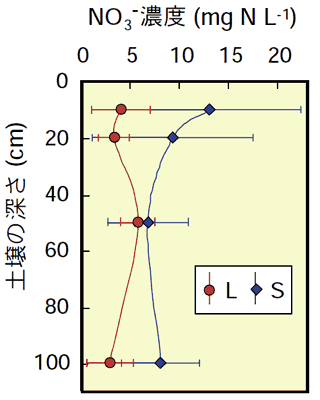 図4は,S・L地点の森林土壌における,土壌水中のNO3-濃度を深さ毎に示しています。通常の森林では,大気から負荷された窒素の大部分は,土壌表層で植物や微生物に利用されるため,下層まで浸透するNO3-量は極めて少なくなります。しかし,筑波山の2つの森林では,下層のNO3-濃度も高かったことから,窒素が土壌中を下方浸透していると考えられます。これは,大気からの窒素負荷量が過多であるために,負荷された窒素を表層で消費しきれないことが主な原因と考えられますが,それに加えて,いずれの森林も高林齢化しているため,生態系の窒素吸収能力が低いことも原因の一つと考えられます。