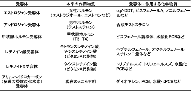 表1に示す各種の受容体を導入した酵母アッセイで,さまざまな化学物質に受容体への作用(結合活性)があることが分かってきました。病気治療の目的で受容体作用を持つように作られた合成ホルモンなどの医薬品を除いて,ほとんどの化学物質の作用の強さは,高いものでも私達が本来体内に持っている受容体作用物質の数十分の1以下です(図2,レチノイン酸受容体の例)。しかしながら,人工的に作られた化学物質は,天然の物質よりも生物体内での分解や代謝が遅いことが多く,持続的に作用したり,本来の作用物質の効果を妨害したりすることで影響を及ぼすと考えられています。特に自然界では,野生生物は環境を汚染している化学物質を避ける術をもたず,近年では作用の強い医薬品などの化学物質が環境中に排出されていることもあり,汚染環境に生息する生物が影響を受けている可能性は否定できません。