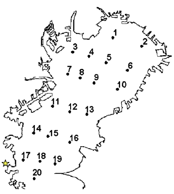 2002年4月,当時の上司の指示で東京湾調査に着手する際,“東京湾の環境と生き物をいかに調査すべきか”を考え,大学院時代の恩師(清水誠・東京大学名誉教授)の東京湾における調査を再開し,発展させようと考えました。東京湾内湾部全域に設定された20の定点(図1)で試験底曳きと環境調査を組み合わせて実施することです。これには漁業者の方々のご協力が不可欠ですが,漁業者の皆さんへの協力要請が難航を極めました。平身低頭で調査協力を依頼したのに,結果を報告しないばかりか,無断で学会あるいはマスコミに発表してしまう例が過去に複数あったため,環境研究者が漁業者に信頼されていないためと思われます。漁業者の皆さんが怒るのは当然です。まず漁業者の皆さんの信頼を得なければと漁業協同組合やその連合会に通い,調査の目的や目標を話しました。数ヵ月を要しましたが,十分にご理解いただけず…最終的に恩師に協力要請の場に同席していただき,恩師の信用でどうにか同年12月から調査をスタートできました。研究者以前に一人の人間として漁業者の皆さんとの約束は守り,年に一度は定期報告し,漁業者の皆さんの知らぬところで勝手に発表しないことを続けてきました。