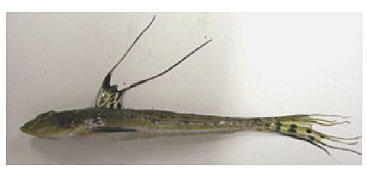 そして,いよいよ,調査実施です。ハタタテヌメリ(図2)の調査を例に示します。まず,天気・海象に注目します。海域での調査は,雨はほとんど気にしませんが,風が出ると波・うねりが高まるため,要注意です。通常,調査前日の正午前の天気予報から調査実施可否について第一回目の判断を行い,機材等を積み込みます。午後7時前のNHK天気予報から第二回目の判断を行い,「明日は予定通り実施」となれば,その晩は早くに就寝します。横浜・柴漁港から午前5時30分頃に2隻で出港ですので,港周辺で前泊無の場合,午前3時前に起床,3時30分に環境研を所用車で出発となります。午前5時過ぎに柴漁港に到着し,船長が出港可否の最終判断を行います。午前5時30分頃に出港しても,湾奥の調査定点に到着するまでに2時間半~3時間かかります。この間,甲板で待機ですが,風にさらされ,波もかぶるので,特に冬場は寒くて辛いひと時です。午前8時~8時30分頃に最初の定点に到着し,作業開始。各定点で水質観測,採水(表層と底層),採泥(底棲生物と底質分析用 : 3回),プランクトンネット,底曳き網と作業は盛りだくさんです(上部写真)。特に採泥が難儀します。船尾から採泥器(18kg)を手で降ろし,垂直に海底に着地させねばなりません。船が揺れても踏ん張ってまっすぐ(垂直)に海底に落とさないと採泥に失敗します。“空振り”10回くらい連続ということもあり,汗が噴き出し,「早くせねば,船長さんたちに迷惑」と気も焦ります。