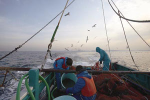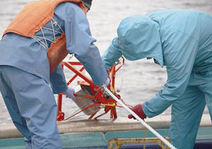 底曳きで獲れた魚介類は,甲板上で研究対象種を選び出すのですが,揺れる船上で下(甲板)を見つめ,小さな獲物も見逃さずに全て拾い上げるため,特に乗船経験が浅い場合,船酔いを招くことがあります。船酔い自体は,個人差があるので仕方ありませんが,重要なことはその後です。たとえ船酔いしても作業を続けることが鉄則!「船酔いで作業が辛いのは皆同じ」と言い聞かせて我慢して作業することが重要です。「船酔いで死んだ人はいない」と言われますし,そうした積み重ねで船にも慣れます。