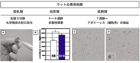 近年,環境を経由した化学物質の子供の健康への影響が懸念されてきています。化学物質に対する子供の生体防御系が未完成であると考えられているためですが,本研究プロジェクトでは動物実験を通じて更に詳しく明らかにしようとしています。特に,私たちは化学物質による発達期中枢神経系への影響についてラットを用いた動物実験を実施しております。
