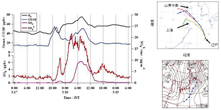 近年,アジア地域では経済的な発展がすすみ,エネルギー消費が増え,大気中への物質の排出が増加しています。「アジア自然共生研究プログラム」における「アジアの大気環境評価手法の開発」プロジェクト(国環研ニュース25巻6号参照)では,サブテーマとして「アジアの広域越境大気汚染の実態解明(観測研究)」という課題をもうけ,地上観測や航空機観測などを行い大気汚染物質の濃度変動,輸送される物質の化学変化,空間的分布や立体的構造の解明を行っています。これまでの観測的研究でわかってきたことを紹介します。