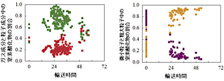 2006年から2007年にかけて辺戸ステーションにおいて窒素化合物の長期観測を行いました。中国での観測は中国環境科学研究院の王博士のグループと,また反応性窒素化合物(NOy)やHNO3の観測は大阪府立大の坂東教授のグループと共同で観測しました。図2に粒子とガスに含まれる窒素酸化物の割合,および,微小粒子と粗大粒子に含まれる窒素酸化物の割合を時間に対して示します。時間ゼロの点は中国での観測結果を用いたものです。この結果から,輸送される間に粒子中の窒素酸化物が増加し,粒子の中では粗大粒子に含まれる窒素酸化物の割合が増加していることがわかります。中国でNOとして放出された窒素酸化物も輸送される間に,HNO3や微小粒子のNH4NO3を経て,辺戸ステーションに到達する時には粗大粒子に多く含まれていることを観測から明らかにしました。