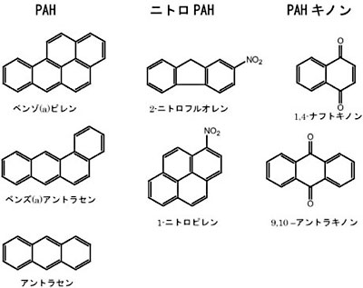 多環芳香族炭化水素( Polycyclic Aromatic Hydrocarbon: PAH)は,二つ以上のベンゼン環を持つ化合物の総称です。PAHは,主に有機物の不完全燃焼によって発生し,スス等の微粒子に付着して有機エアロゾル粒子として大気に排出されます。日常用いる工業製品(精油,潤滑油,殺虫剤,接着剤及び塗料等)にも揮発性のPAHが含まれていますが,これらがガスとして大気に排出されることもあります。