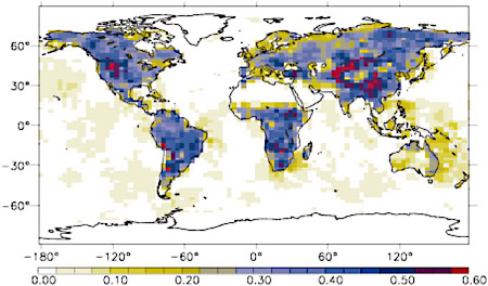 衛星打ち上げ前には,インバースモデル解析から炭素収支を推定する際に,GOSATの観測データが吸収・排出量の不確かさの低減にどの程度貢献し得るのかの推定研究が行われました。フランスの研究グループは,全球を3度×3度(緯度×経度)の格子に細分した領域の多くで不確かさがおよそ3分の1になると報告しました(図1)。