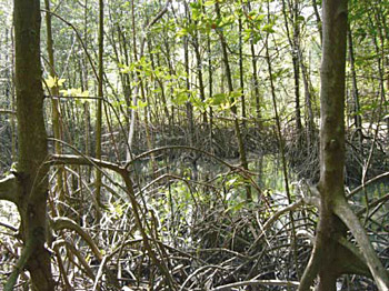 ベトナム南部,樹齢31年,自分とほぼ同年齢のマングローブ林の中,携帯式GPSに表示された緯度経度を頼りに進行方向を探る。行く手を阻むマングローブ支柱根の数々をまたぐべきか,くぐるべきか,はたまた支柱根の上に乗ってしまった方が次の一歩が出やすいか,容赦なく襲ってくる蚊の大群を振り払いながら,膝近くまでもぐる泥の中を進む。そんな折,視界が急に開けたと思ったら,目前に幅150cmほどの水路が横たわっていた。「水路があります!」と後方の2人に向かって声を張り上げる。「またいで渡れませんか?」と返ってくる。「無理と思います!」と返す。「浅い?いっそ川底を歩けませんか?」と再び返ってくる。思い切って川べりにある支柱根につかまりながら片足を川の中へ突っ込んだ瞬間,腰まで泥水に浸かってしまった。足先はまだ川底を捉えておらず,「無理ですー!」と弱々しく繰り返す。仕方がないので,一度戻って土手に上がり,別の場所から林内を目指すことにする。一時間ほど歩き,あともう少しで土手というところで,先頭のA氏が「あ,蟻の巣」とつぶやくや否や,全身を切りつけられるような痛みが襲ってきた。どうやら攻撃的な葉切り蟻の巣に踏み込んでしまったらしい。あっという間に全身を赤茶色の蟻の集団が覆う。「いたたた!」あまりの痛さと恐怖に,なりふり構っている場合ではない。3人とも,これまでにない素早さで土手に駆け上がり,身に着けている全ての物を投げ出して蟻を振り払う。この日の晩,宿泊所の食堂でぎこちなく動く扇風機に扇がれながら「生きているなあ」としみじみ飲んだ氷入りのサイゴンビールは格別だった。