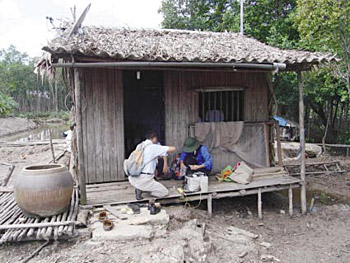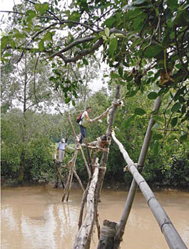 国立環境研究所では2006年度から,メコン河を対象とした環境影響評価研究を推進しており,湿地植物を専門としている私はメコンデルタに広がるマングローブ生態系の調査研究をしています。メコンデルタのマングローブ林は多様な生物を育む生態系で,地域住民に生活の糧をもたらす貴重な森ですが,近年の著しい都市化や産業開発によって,様々な影響を受けています。そこで,私たちのプロジェクトでは環境変化によってもたらされる水質変化がマングローブ生態系へ及ぼす影響を調べるため,マングローブ林の水土壌の理化学性や,微生物活性などを測定しています。冒頭の様子は,マングローブ林の中へ調査候補地を探しに出かけた時の出来事です。毎回のように大変な思いをするわけではありませんが,マングローブという森は,気軽に「ちょっとそこまでサンプルを採りに」出かけられるところでないことは確かです。泥深い林内では長靴は全く用を成さず,はじめの一歩で泥にのまれてしまうため,地下足袋の中へズボンの裾をしっかりと入れて装着します。場合によっては膝上まで沈んでしまうこともあり,歩くというよりは漕ぐといった方が正しいかもしれません。雨季は当然ですが,乾季でも調査中に突然の大雨に見舞われることは多く,調査機器の防水には万全の態勢で臨みます。雨だけならいいのですが,雷が発生したときは,「どうか落ちませんように」とひたすら祈りながら汽水で覆われた森から引き上げます。効果はさておき,蚊よけグッズも無いよりはましです。あちこち刺されては集中できませんし,ベトナムでは蚊を媒介して感染するマラリアやデング熱という病気があります。