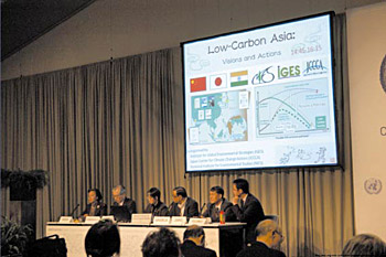 12月10日に地球環境戦略研究機関(IGES)及び全国地球温暖化防止活動推進センター(JCCCA)と共同で,「低炭素アジア-ビジョンと行動-」と題するサイドイベントを開催しました。ここではNIESが開発した低炭素社会へのロードマップ検討手法をアジアの国や都市に適用し,高い生活水準を保ちつつも大幅な温室効果ガス削減が可能なことが示せたことを踏まえ,中国,インド(アーメダバード),日本(滋賀県及び京都市)を対象にした研究成果を中心に,その実現方策などを説明しました。各国からの参加者により会場は満員となり,質問や意見交換が活発に行われました。甲斐沼室長と藤野主任研究員は,本イベントの他,アジアの共同研究者とともに各国機関が開催した関連するサイドイベントにプレゼンターとして参加し,研究交流と成果の普及に尽力しました。