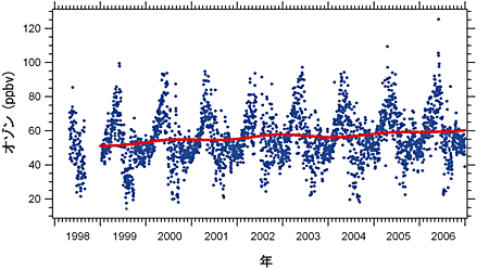まず,最近10年間(1998~2007年)の日本における春季の対流圏オゾンの変化を導出し,アジアからの人為起源汚染物質の排出量推移との関係を定量的に調べました。日本において空気が清浄な地域に位置する9地点における春季の対流圏オゾンの変化は,離島などの地上では最近10年間の変化の程度は小さく統計的にも有意な差ではない一方で,標高の高い山岳地域では変化の程度が大きく統計的に有意なほど大きく増加していました。例えば,長野県・八方尾根観測所における連続観測データには,年率1ppbvもの平均濃度の増加が検出され(図1),これは欧米における報告例(年率0.5~0.8 ppbv)と比較しても大きな値でした。また,2003年以降は80ppbv以上の高濃度オゾンが観測された日数が顕著に増加しており,2003~2006年における「高濃度オゾン日」は1999~2002年の2倍にもなっていました。つまり,植生影響などに重要なベースライン濃度がじわじわ増加しているだけでなく,人間の健康に悪影響を及ぼしうるくらい高濃度になる日数もここ数年で急激に増えているわけです。最新の統計値を用いて2007年まで更新した排出インベントリー(排出源の分布や強度を地図状にしたもの)を化学輸送モデルに組み込んで過去10年間の長期シミュレーションを行ったところ,モデルによる計算結果は概して観測された傾向をよく再現したものの,山岳地域において観測された大きな増加率は約半分しか再現されませんでした。観測とモデルの不一致は,モデル中でアジア大陸からの越境汚染の影響が過小評価されていることを示しており,現在の最先端のモデルでさえ,成長著しい東アジアからの人為起源排出量か,そこで生成したオゾンの輸送量を過小評価している可能性が考えられました。