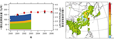 現在では,大気汚染物質は1~2週間かけて北半球を一周し,大陸間を輸送されることが分かっていますが,影響が大きいのはやはり近傍の発生源です。そこで,オゾンを作るもととなる物質のひとつであり,燃焼により大気中に放出される一酸化炭素について,東アジアにおける2000年以降の排出量推移を調べるため,地上観測とモデルおよび衛星観測を組み合わせて解析しました。大気中濃度から排出量を逆推計するモデルを適用することで,2005年における東アジアからの一酸化炭素排出量を算出しました。当時2003年まで公表されていたインベントリーによる排出量推計値および2001年に観測が開始されたMOPITT(Measurements Of Pollution In The Troposphere)衛星観測による大気中一酸化炭素濃度の推移とを比較すると,概ね良く一致する結果が得られ,2000年代前半における中国からの一酸化炭素排出量の伸びは+16%であるという結果が得られました(図2)。中国では近年,生物燃料・石炭から石油・電力へと比較的クリーンなエネルギーへの転換が急速に進んでおり,これまで主要な発生源であった民生利用からの排出はやや減少しましたが,都市部の産業発展に伴って工場からの排出が増加している結果,総排出量がやや増加傾向にあると解釈できました。