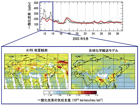 (左下) AIRS衛星センサーによって観測された,2003年9月11~13日のユーラシア大陸上空における一酸化炭素の気柱全量の分布。衛星観測では,シベリアの森林火災によって放出された一酸化炭素が東方に長距離輸送されている様子が見て取れる[Tanimoto et al., 2009]。