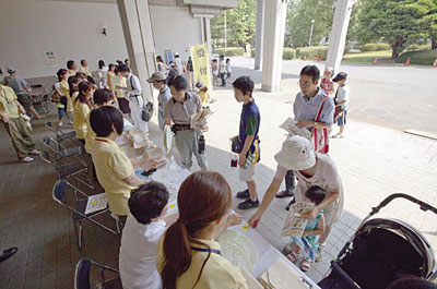 開催に当たり昨年に引き続き、今年もチラシやポスター、ホームページにおいて、来所者への公共交通機関利用を呼びかけました。具体的には、(1)TXつくば駅からの無料循環バスの運行(産業技術総合研究所との共同運行)、(2)「つくバス利用券」の発行(つくば市内のコミュニティーバスの活用)、(3)JRひたち野うしく駅からの無料シャトルバスの運行です。以上の取り組みに加え、つくば市等の協力を得て、「つくバス」学園南循環の環境研前への臨時停車を実現しました。また、TX車内及び駅構内におけるポスター掲示のほか、小中学校を通じたチラシの配布、ショッピングセンターにおけるチラシの配布活動、ラジオでの案内等、これまで以上のPR活動に努めました。その結果、猛暑日だったにもかかわらず、3,340名もの方々に足を運んでいただき、盛況のうちに幕を閉じることができました。
