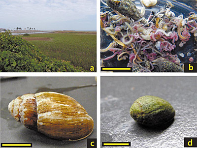 調査地は、三重県津市にある田中川の河口部に発達した小さな潟湖干潟です(図2)。田中川は住宅地や水田地帯の中を流れて伊勢湾に注ぐ小さな河川で、河口の南側には南北370m、東西150mほどの潟湖が袋状に発達し、干潟とヨシ原が自然に近い状態で残されています。満潮時には河口から海水が流れ込むため、多くの汽水性ベントス種が生息しています。ヨシ原内にはオカミミガイ類、ヘナタリ類、ベンケイガニ類などが生息し、潟奥部には淡水流入により局所的な低塩分環境が形成されています。私は、裸地干潟とヨシ原内をそれぞれ調査対象とし、生息するベントス種の安定同位体比を測定するとともに、底土有機物組成や底生のクロロフィル量を地点間で比較しました。餌資源候補としてはヨシの葉、底生微細藻類、海水中の植物プランクトン、淡水中の植物プランクトン、干潟上の海藻などを年に何度か採取し、安定同位体比を測定しました。