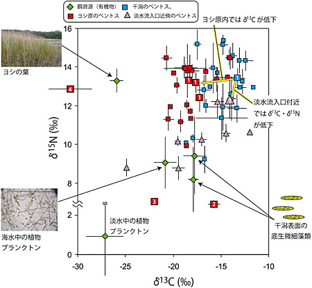 ベントスのδ13Cは、干潟部で高くヨシ原内で低い傾向がみられました。一般に、ベントスのδ13C・δ15Nは一定期間に消化・吸収した餌の値を反映しており、δ13Cは餌とほぼ同じか1‰程度上昇し、δ15Nは3~4‰上昇することが知られています。干潟で採取されたベントスのδ13Cは-19‰よりも高いことから、底生微細藻類や海水中の植物プランクトンが彼らの主要な餌であり、δ13Cが低いヨシや淡水性植物プランクトンの寄与は小さいことがわかります。一方、ヨシ原内では光が遮られるため底生微細藻類の増殖が制限され、さらに枯れたヨシが底土上に蓄積しているため。餌としてのヨシの寄与が高まると考えられました。ヨシ原内のベントスが示したδ13Cは、それでもヨシと比べて5‰以上高い値でした。このことは、ヨシがあくまで「補助的な餌」として彼らに利用されていることを示唆しています。ヨシ原に暮らすベントスの中には高いδ13C(>-15‰)を示す種も幾つかみられましたが、これらの種は干潟部から運ばれてきた底生微細藻類を食べている可能性があります。また、淡水流入口に近い干潟で採取したベントスでは、δ13C・δ15Nともに低下する傾向がみられました。同一種内で比較してみても(図3;例えば巻き貝のフトヘナタリ)、同様の結果が得られています。この結果は、隣接した水路から流入する淡水性プランクトンが、潟奥部に暮らすベントスの二次生産に寄与していることを示しています。