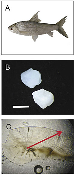耳石(じせき)とは脊椎動物が頭部にもつ骨の一種で、文字通り聴覚やバランス感覚などをつかさどる組織です。硬骨魚類の場合、成長に伴って周囲の水(淡水魚なら河川水)からカルシウム(Ca)を取り込んで毎日1本ずつ輪紋を形成しながら大きくなります。その際に、Caと共に同じアルカリ土類金属に属するマグネシウム(Mg)、ストロンチウム(Sr)、バリウム(Ba)などの元素も河川水から耳石に吸収され、一度吸収されると生涯にわたって安定的に保持されることが分かっています。この耳石に取り込まれる元素成分を分析することで、これまで回遊魚の知られざる生態が数多く明らかにされてきました。中でも、サケやウナギなどの海水と淡水を行来する魚の回遊履歴が、海水と淡水とで100倍以上も濃度に開きがあるSrをマーカーとして盛んに研究されてきました。