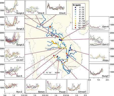 では河川水の元素濃度が耳石に反映されるかどうかについて、メコン川に広く分布する回遊魚Siamese mud carp (Henicorhynchus siamensis)(図1)を対象とした解析結果を紹介します。H. siamensis は体長15cmほどのコイ科の小魚ですが、タイ、ラオス、カンボジアなどどこへ行っても目にする魚で、漁獲量はメコン川の淡水魚の中で随一、メコンの人々に最も親しまれている魚です。それは、この魚のクメール語名「トレイ・リエル」がカンボジア通貨のリエルの語源であることからも分かります。上記3国の市場という市場でかき集めた数千尾分の耳石を研究室に持ち帰り、その中からH. siamensis の耳石を選び出し、耳石核から外縁にかけて、つまり成長に伴う各種元素の濃度変化(プロファイル)を求めました(図2)。ここではSrに注目してみます。各々の地点(市場)で数尾ずつ採集しましたが、同じ地点の魚からは互いに似かよったSrのプロファイルが得られています。図2中のGam-2などの地点では2つのパターンが見られますが、両者では採集した季節が異なります。同一河川内の地点間でもプロファイルはある程度似ていますが、異なる河川間ではその形状が明らかに異なります。またU字型をしたプロファイルが多いことも特徴です。
