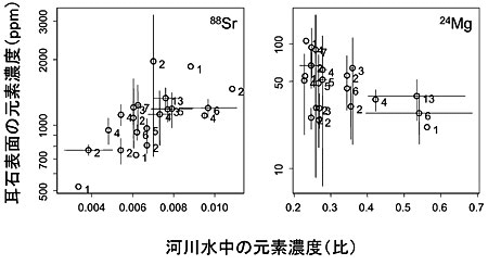 再び図2の説明に入る前に、LA-ICP-MSにより測定した耳石表面の元素濃度と、魚を採集した市場に最寄りの地点での河川水中の元素濃度との関係について見てみましょう(図3)。今度はレーザーを耳石の切片ではなく“表面”に直接照射しました。耳石表面のSr濃度は河川水のSr濃度(厳密には耳石主成分であるCaで標準化するため比を求めた)に対して正の相関を示しました。つまりその魚が(漁師の網にかかる直前の)最後に曝露された環境中のSr濃度が、しっかり耳石の一番外側に反映されている証です。正の相関は他にもBa、亜鉛(Zn)、ナトリウム(Na)などにも見られましたが、意外なことにMg、Mnそして銅(Cu)は負の相関、特にMgは非常に有意な負の相関がありました。そのメカニズムはまったく分からないのですが、耳石と環境中のMgの負の相関は、北米のカットスロートトラウト(ニジマスの仲間)からも報告されています。