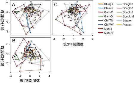 上記の大前提の後半部分(河川水の元素濃度が耳石に反映される)もなんとか成立しそうです。負の相関であってもマーカーとしては十分に機能します。そこで耳石表面の元素情報だけからどこで採集されたかがはたして判別できるものかどうか、測定したすべての元素を使って判別関数分析を行いました(図4)。この図から、いくつかの採集地点は空間的にオーバーラップするものの、明らかに耳石表面の元素成分が異なるが故に、その他の地点から分離されるものがありました(Gam-2、Gam-5、Chia-Kなど)。タイのコラート高原を流下するいくつかの支流の採集地点(Mun、Chi、Songkなど)は、同じ地質の影響が河川の水質に反映され、さらにはそれが耳石表面にも反映されるためか、現状では採集地の判別が困難です。しかし、新たなマーカーが見つかれば判別能力はさらに向上するはずです。