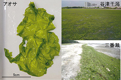 最近になって「赤潮」や「青潮」の他に新たに「緑潮」が加わり、沿岸各地で新たな環境問題を引き起こしています。この「緑」の環境問題は「グリーンタイド」と呼ばれるもので、海藻アオサ属(Ulva spp.)が異常増殖し海岸線に堆積する現象を指します(図1)。グリーンタイドは世界各地で発生が報告されており、アメリカのチェサピーク湾やフランスのブルターニュ地方、北京オリンピックのボートレース会場となった中国のチンタオなどでの発生事例が有名です。日本国内では1990年代以降、東京湾や瀬戸内海、九州各地の沿岸浅海域などで発生が確認されています。グリーンタイドの発生によって、沿岸域の景観の悪化、海藻の腐敗に伴う悪臭、アサリなどの貝類の死滅、など様々な悪影響が懸念されています。各自治体が年間に数千万円もの費用を投じてグリーンタイドの除去・廃棄を行っていますが、毎年発生するグリーンタイドに対して有効な対策がないのが現状です。