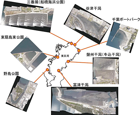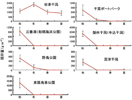 調査は、グリーンタイドの発生状況や地形学的な特徴が異なる東京湾内の7ヵ所の浅海域(図2:野島公園、東扇島東公園、三番瀬、谷津干潟、千葉ポートパーク、盤州干潟、富津干潟)で、2009年10月から秋、冬、春、夏、と季節ごとに実施し、アオサの現存量と種構成比の季節変化を調べました。種構成比については、アオサは形態による分類が困難であることから、遺伝子解析によって種の同定を行いました。
