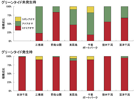 続いて、図4にグリーンタイド未発生時と発生時でのアオサ種構成比を示します。未発生時には各調査地点で点在する小さなアオサ断片を12個体拾い集め、その種を調べました。また谷津干潟については常にグリーンタイドが発生していたため未発生時のグラフからは省略しています。アオサの現存量が少ないグリーンタイド未発生時をみると、全ての調査地点で在来種のアナアオサやリボンアオサ、新種のミナミアオサが混在していることがわかり、ミナミアオサが東京湾内に広く分布していることが確認されました。アオサの現存量が多くなるグリーンタイド発生時には、全ての調査地点でミナミアオサが占める割合が最も多くなり優占種となっていました。いくつかの調査地点では、アナアオサやリボンアオサの存在も確認されましたが、ミナミアオサに比べ遥かに小さい比率となっていました。これらの調査結果から、東京湾では環境問題となっているグリーンタイドを形成する種はミナミアオサのみであることが明らかになりました。このミナミアオサは現在のところ東京湾では侵入種(元々その地域に存在しない種が他の地域から加入したもの)と考えられています。つまり東京湾では、環境問題であるグリーンタイドは、他水域で指摘されている海域の富栄養化ではなく、従来生息していなかったミナミアオサの侵入が発生の原因となっている可能性が示されました。東京湾ではチチュウカイミドリガニやホンビノスガイなど多くの侵入種の定着が確認されています。ミナミアオサについてもその侵入経路の解明は今後の課題となっています。
