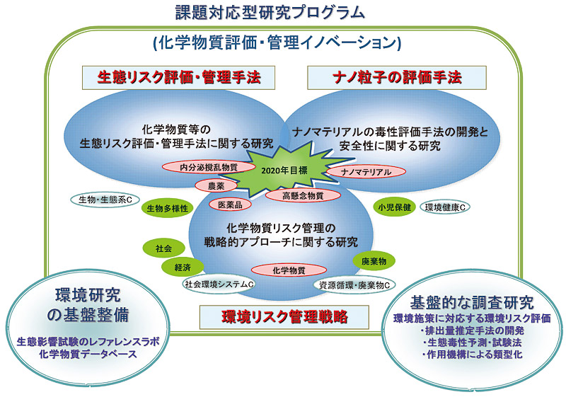 課題対応型の「化学物質評価・管理イノベーション研究プログラム」(図参照)では、化学物質等の生態リスクの研究を進めて、種個体群の存続可能性や生態系機能等の観点から、評価の対象となっている生物の個体群への影響と生態系保全の関係について整理し、また、化学物質やナノマテリアルの毒性評価手法の開発と安全性に関する研究や生態影響の試験及び評価に関する研究を進めることにより、新しい考え方に基づく化学物質のリスク評価手法を提示することを目指しています。これにより、内分泌かく乱化学物質や難溶性物質等への対策を含む環境施策の推進、環境行政にとって重要な試験法の開発研究や評価の枠組みを提案します。さらに、これらのリスク管理について、多様な影響や特性を持つ多数の化学物質に対する効果的かつ効率的な管理のため、リスク要因の時空間特性の解明など評価手法の高度化に関する研究を行うとともに、リスクの特性や科学的知見の確からしさを考慮し、科学的不確実性の高い段階で最適の対策を選択する方法の開発など、新たな手法を導入することにより化学物質の環境リスク管理の戦略を示すための研究を実施します。