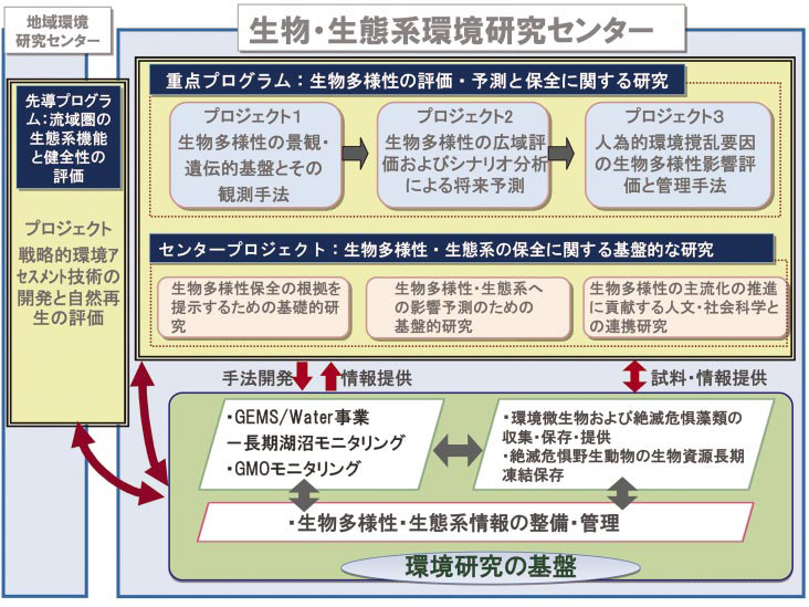 生物・生態系環境研究センターでは、地球上の多種多様な生物と、それらが暮らす生態系の構造と機能に関する研究に基軸を置きながら、第3期中期計画の5年間に「生物多様性・生態系の保全の実践」を支える研究を進展させます。そのためのフレームワークは図に示す通りです。中心に課題対応型の「生物多様性重点研究プログラム」を置き、生物多様性の現状の把握と、保全策の効果を予測し評価する手法の開発を行います。一方、センタープロジェクトは、研究者が自由な発想で実施することができる提案型研究で構成し、基礎研究から人文・社会科学との連携を重視した研究を実施します。また、地域環境研究センターとの連携研究プログラムに参画し、アジア流域圏での生態系機能の定量化の研究を通して、最適な生態系の保全・再生の方法を探ります。