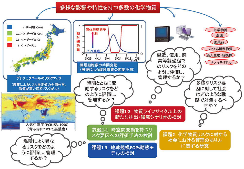 このため、(1)化学物質動態と曝露の時空間分布の評価手法の研究、および(2)化学物質リスクに対する社会における管理のあり方に関する研究、の2サブテーマ構成での研究を進めることにしました。具体的に、以下のような検討を進めています。