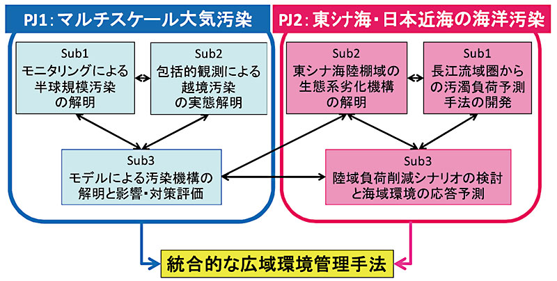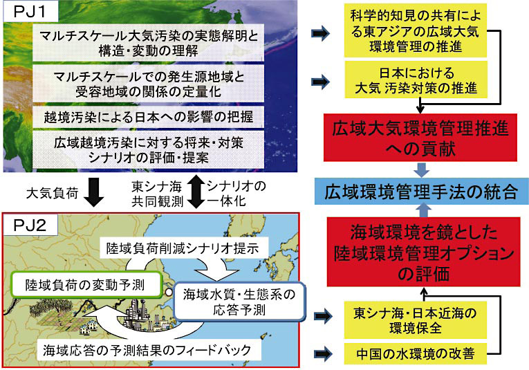 国立環境研究所では前の中期計画(2006~2010年度)において、アジア自然共生研究プログラムを実施し、アジアにおける大気・水環境と生態系の実態を把握し政策を評価するための手法の開発、それを活用した地域環境の理解、国際共同研究や研究者ネットワークへの参加を進めました。この蓄積をもとに、東アジアの広域的で国際的な環境問題の発生メカニズムを科学的に明らかにして、問題を解決するための政策や国際的な枠組み作りに科学的な情報をインプットすることを目指して、現在の中期計画(2011~2015年度)において、「東アジア広域環境研究プログラム」(図1、図2)を開始しました。このプログラムの研究対象は、一つは東アジアの大気汚染問題(プロジェクト1)、今一つは東シナ海・日本近海における水質汚濁問題(プロジェクト2)です。