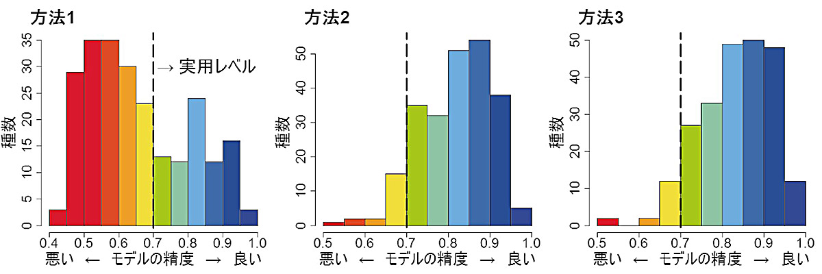 以上の3つの偽不在情報の選び方がモデルの推定精度にどのように影響するか、日本の維管束絶滅危惧植物のデータを用いて、比較を行いました(図)。図の水平軸はAUCという指標で、分布推定モデルの精度の評価によく用いられます。0から1までの値をとり、大きいほど精度がよく、0.7以上であれば実用的とされています。垂直軸は、それぞれのAUCの値をとった種数です。まず、方法1でAUCの値が0.7を下回る種が極端に多いことがわかります。あたかも確実な不在情報がたくさんあるかのように無闇にデータを与えると、適した環境まで不適と強く判定してしまうようになるためと考えられます。これに対して、方法2と3はほぼ変わりなくよい成績を収めています。解析を行った当時、3の方法が優れているという報告が相次いでいたので、これは意外な結果でした。2の方法は生育に適した環境も偽不在地点に選んでしまう欠点はあるものの、幅広い環境条件にまたがる地点を選ぶことの利点が欠点を上回ったものと思われます。今回は日本の絶滅危惧植物のデータでの検討でしたが、データの特徴によっては、2と3いずれかの方法がより優れている場合もあるかも知れません。今後は、日本の固有植物やアジア太平洋地域の植物の分布情報などでも2と3の方法の比較を行なってみたいと考えています。