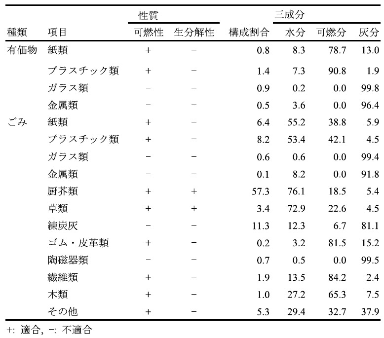 分析の結果、家庭系ごみのなかでは厨芥類の構成割合が最も大きく、水分も最も高いことがわかりました(表1)。また、多くの家庭で練炭を調理用燃料として利用しており、家庭系ごみの中では練炭灰が無視できない構成割合を占めることが確認できました。有価物の構成割合は3.6%で、有価物として分類した紙類、プラスチック類の水分は10%を下回っていました。これは選別作業の時点で極度に水分を含んでいるもの、汚物が付着しているものは有価物とは見なさなかったことが原因です。