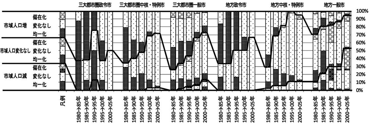 一般市では、偏在化する例も多く見られます。人口増加に伴って偏在化が生じた一般市では、都市規模の割には大規模な開発が行われて、人口が集積した地区が生まれたことが伺われます。一方、地方一般市では、人口減少に伴う偏在化が起きた例が最近多く見られます。人口規模が小さいメッシュでの人口減少が著しく、いわゆる過疎化が急速に進んでいることが伺われます。