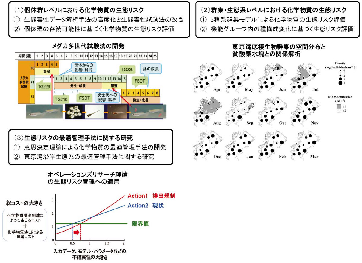 生態リスクPJ1では、このような視点にたって、生態リスクの研究を個体群のレベルと群集のレベルに大別し、サブテーマ1「個体群レベルにおける化学物質の生態リスクに関する研究」、サブテーマ2「群集・生態系レベルにおける化学物質の生態リスクに関する研究」を計画しました(図1)。サブテーマ①では、個体群レベルの影響評価に有効な生態毒性試験法の開発と数理モデルによる解析を連携させ、サブテーマ2では、後で述べる3種系の生態リスク評価モデルの開発とともに、東京湾の底棲魚介類や霞ケ浦の動物プランクトンの群集解析を通じて栄養塩負荷や化学汚染による生態系機能への影響評価を試みています。さらに、環境リスクを低減するための管理コストを考慮に入れた上での最適な管理計画を選定する数理的な方法を、サブテーマ3「生態リスクの最適管理手法に関する研究」で開発しています。今回の記事では、サブテーマ1と2の生態モデリングに関する部分を紹介したいと思います。