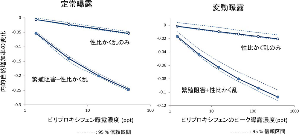 繁殖毒性に関しては、ミジンコの体内で化学物質濃度がどう変動するかを1次の毒物速度論モデルによってモデル化したうえで、繁殖影響モデルとして動的エネルギー分配モデル(DEBtoxモデル)を採用しました。DEBtoxモデルは、生物が摂食によって得たエネルギーを、繁殖、個体成長、基礎代謝などに分配するパターンを記述する生物生態学の数理モデルです。このモデルを利用すれば、化学物質の毒性による繁殖への影響を、卵細胞形成不全などの直接影響と、体成長の遅延を介する不可逆な間接影響を分けて推定することができ、化学物質の曝露濃度が時間的に大きく変動する場合でも、毒性反応をうまく再現できます。 これらの2つのモデルの結果をミジンコの個体数変動モデル(齢構成個体群モデル)に組み込むことによって、個体群増加率に対する毒性影響を推定しました。シミュレーション計算の結果、性比かく乱作用による個体群レベルの効果は、繁殖阻害による効果の4分の1程度であることが示唆されました(図4)。