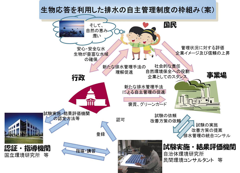 WETシステムを日本に導入しようとする場合、試験法や科学的な根拠は米国WETと大きく変わらないと考えられますが、法的な措置や運用面では日本に適した変更が必要となるでしょう。制度のあり方については、現在、環境省の「生物応答を利用した水環境管理手法検討調査」委員会で検討中ですが、仮に社会で必要とされる役割分担の全体予想図を図1に示します。まず、試験に関する認証機関を何れかの公的機関が担う必要があり、実際にバイオアッセイを実施する上では地方環境研究機関、地方衛生研究所および民間の環境コンサルタント会社などがその公的な認可を受けることになります。バイオアッセイ技術の標準化および高度化の教育機関も重要です。また米国では州の法律によってWETが強制的に施行されており、罰則規定もありますが、日本では社会的なインフラ整備と国民の理解を得てからでないと性急に罰則を伴う規制を作るのは困難だと思われます。事業者がWETを導入するメリットとしては、生物影響の大きい排水を公共用水域に放出せずに生態系を保全するという社会的責任の遂行や、排水の環境汚染事故の未然防止または影響があった場合の原因追究などが考えられます。工場の新設や増改築の際の環境アセスメントや製造工程・排水処理の変更にともなう排水質の変化予測などにも応用可能です。またバイオアッセイを用いた排水管理手法は米国、カナダ、韓国など世界各国で既に行われており、世界標準になりつつあるという点からも国際競争力の一つとしてこのシステムを取り入れるのは事業所にとっては決して不利にはならないでしょう。当面は各種産業界の自主行動計画や自治体の推奨基準として使われる可能性が期待されます。